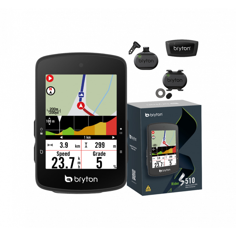 | Description | The Bryton Rider S510 is a feature-packed, easy-to-use device designed for all cyclists from athletes to casual riders. With a vibrant 2.8â€A colour touchscreen and an intuitive interface, the Rider S510 offers seamless navigation and real time performance tracking. 2.8â€A COLOUR TOUCHSCREEN & LIGHT SENSOR: The Rider S510 features a 2.8-inch colour touchscreen with an adaptive light sensor that automatically adjusts the backlight, ensuring clear visibility in any lighting condition. With a user-friendly interface that displays detailed cycling data, it keeps all essential information at your fingertips. EXTENDED 30-HOUR BATTERY LIFE: Designed for long rides, the Rider S510 provides up to 30 hours of battery life on a single charge, so you can explore from sunrise to sunset without needing to stop and recharge. UNLIMITED CLIMBING DATA: With Climb Challenge 2.0, say goodbye to preloaded routes! Using advanced technology, this feature uses smart prediction to provide real-time climb data whether youâ€TMre following a preloaded route or not. SEAMLESS NAVIGATION WITH TURN-BY-TURN ALERTS: Navigate easily with preloaded maps that guide you turn-by-turn, showing road names and remaining distances at each turn. Miss a turn? No worriesâ€" the Rider S510 recalculates your route without a phone connection, ensuring a hassle-free journey. AUTO SYNC WITH 3RD PARTY PLATFORMS: With the Bryton Active app, you can automatically sync your cycling data with third-party platforms like Strava, TrainingPeaks, and Komoot, and easily share your riding activity. Routes planned on Komoot, Ride with GPS, and Strava are automatically synced to your app and device. BLUETOOTH & ANT+ CONNECTIVITY AND SENSOR SUPPORT: Through Bluetooth or ANT+ connectivity, it supports a variety of cycling accessories, including heart rate from smartwatches, electronic shifting systems, and rear bike radar, enriching your riding experience. SENSOR BUNDLE: Available as Device only (S510 E) or as a Sensor Bundle (S510 T) which includes Smart Speed Sensor, Cadence Sensor and Heart Rate Monitor. FEATURES VOICE SEARCH: With an internet connection, you can use voice search for any location. It recognizes over 100 languages for a quick search experience through Google. OSM & BIKING POIâ€TMS: The Rider S510 comes with pre-loaded OSM (OpenStreetMaps) maps, featuring enhanced zoom level 16 and on-screen POIs like bike shops, water stops and more. Also includes MTB trails and other offroad features. CLIMB CHALLENGE 2.0: The Rider S510â€TMs Climb Challenge 2.0 redefines your climbing experience by delivering real-time ascent insights without the need for a preloaded course. QUICK STATUS MENU: The redesigned Quick Status Menu provides a quick view of essential ride information like GPS, time, and battery level. It can be customised with lap data, power calibration, and more for a personalised cycling experience. TURN-BY-TURN NAVIGATION: During route guidance, it provides detailed turn information, including street names, points of interest, peaks, distance, and direction, all displayed on the preloaded OSM (OpenStreetMap) maps. ADVANCED ROUTING: When following a route and riding off-track, the Rider S810 will re-route to get back on track. STRAVA LIVE SEGMENT: The Rider S510 uses Strava Live Segments to provide real-time performance comparisons against PRs, friends, or KOMs. It alerts you to starred segments and tracks time differences. ADVANCED WORKOUT FEATURES: Using the Bryton Active app, you can quickly create or import training plans. During training, the steps are displayed graphically, with a progress bar shown, and zoom functionality supported on the device. INDOOR SMART TRAINER: The Rider S510 integrates with indoor smart trainers via ANT+ FE-C, enabling precise control of resistance and power settings. Enjoy custom training with Smart Workout mode or simulate outdoor routes with Virtual Ride. VIRTUAL RIDE: It can connect and pair with most commercially available smart trainers. By importing route files, it can simulate the real gradient of each segment of the terrain. CYCLING DYNAMICS SUPPORT: Offering comprehensive power training support and data analysis. Paired with a compatible pedal power meter, it displays dynamic data like riding positions, power distribution, PCO, and left/right balance. BIKE RADAR SUPPORT: With a connected ANT+ Rear-View Radar System, cyclists can detect vehicles up to 190m behind. Visual and audible alerts are displayed on screen to warn of approaching vehicles. SPECIFICATIONS GENERAL