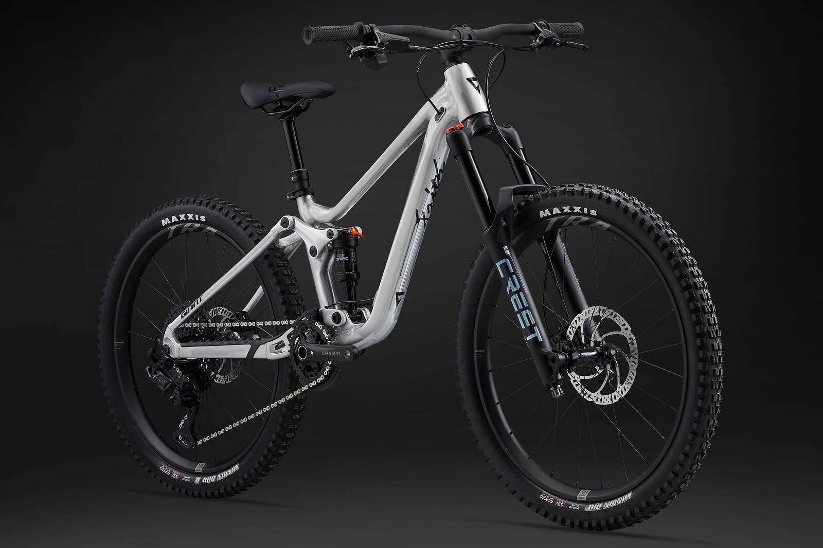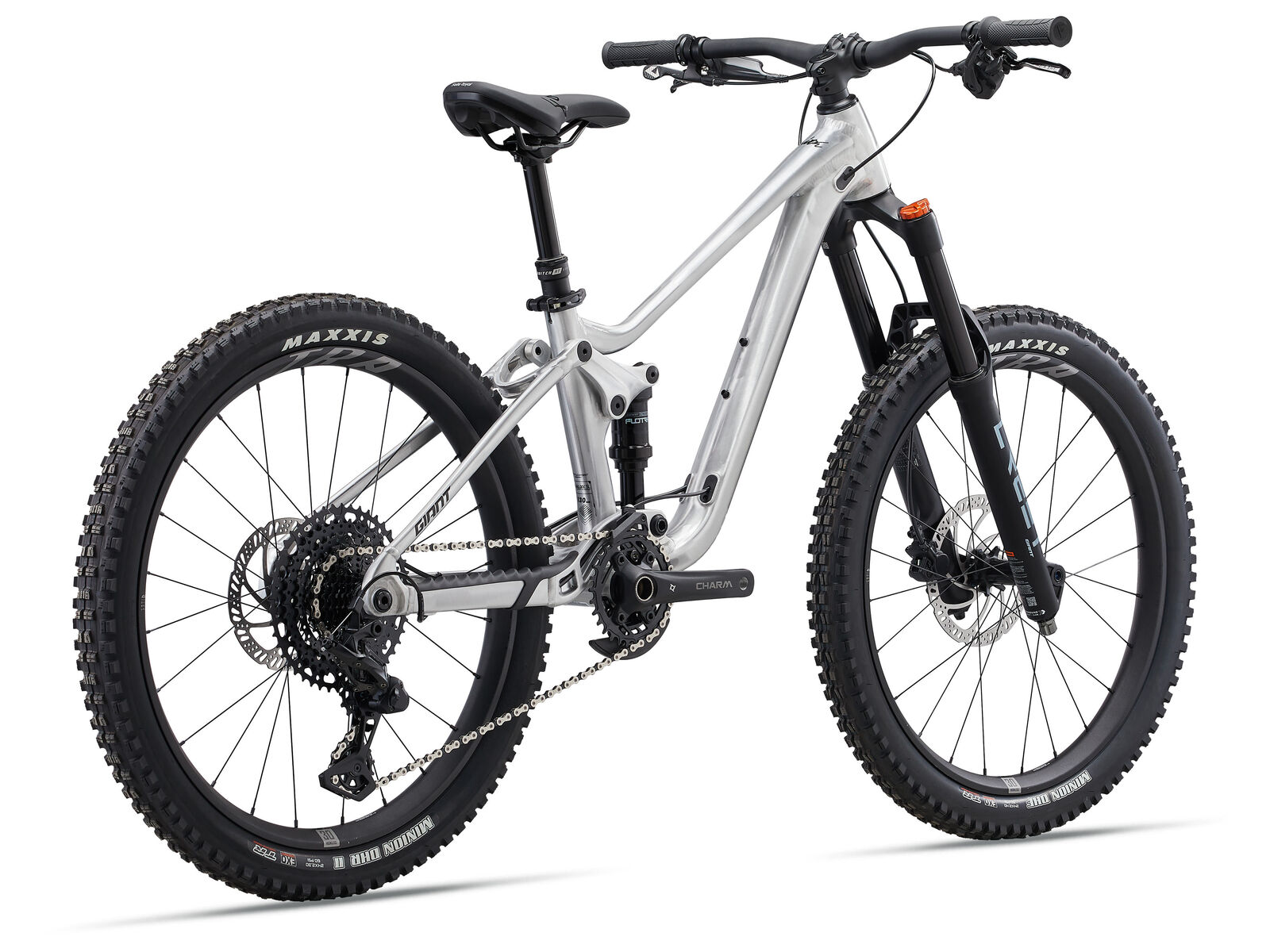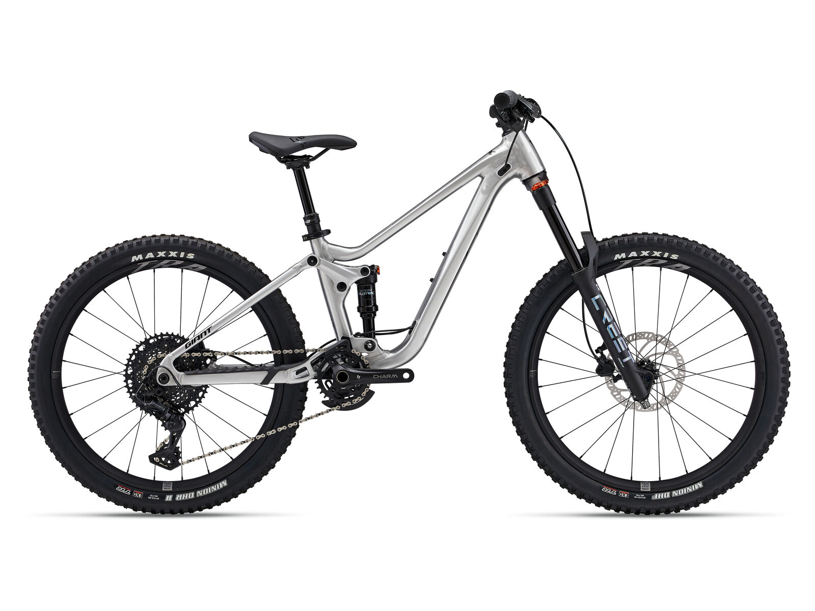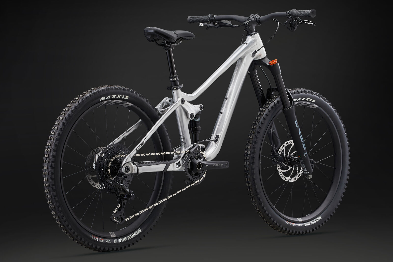 | Style | Small but mighty, this highly capable new trail bike is made for little rippers with big ambitions. With a lightweight alloy frame, 24-inch wheels, and youth-tuned suspension, it balances efficient climbing, loads of traction, and confident handling to help young riders take it to the next level.ALUXX SL Aluminium Technology - This High-Performance level, state-of-the-art aluminium material is made predominantly from 6011 alloy and delivers best-in-class strength-to-weight ratios. These framesets also feature unique welding technologies for high-performance ride quality. FlexPoint Suspension Technology - A proven “single-pivot” design that uses the flexing action of the chainstay/seatstay junction to produce a lightweight and durable suspension system with 4.7 inches/120mm of rear travel. OverDrive - Giant's original oversized fork steerer tube technology. Designed to provide precise front-end steering performance, the system's oversized headset bearings (1 1/4" lower and 1 1/8" upper for road, 1 1/2" lower and 1 1/8" upper for mountain) and tapered steerer tube work in conjunction to provide optimal steering stiffness. Tubeless System - Fewer flat tires. Greater traction. Less rolling resistance and a smoother, faster ride. Giant's Tubeless System makes it easier than ever to experience all these benefits. Specifications:Sizes One SizeColours Raw Aluminium Frame ALUXX SL-Grade Aluminium front and rear triangles, 12x148mm thru-axle, 130mm FlexPoint suspension Fork Crest TR Elite Lite, FloTune Lite Damper, 140mm Shock Crest FloTrac Lite, 165/45mm, trunnion mount Handlebar Giant Contact TR, 20mm rise, AL6061 aluminium, 680mm Grips Giant small-hand Stem Giant Contact, 8 degrees, 40mm Seatpost Contact Switch AT Lite, 100mm Saddle Selle Royal Vivo Jr Pedals Giant Pinner Lite Shifters MicroSHIFT Advent X Trail trigger shifter SL-M9505-R (with nanowire) Front Derailleur Rear Derailleur Microshift Advent X RD-M6205AM Brakes Tektro [F]180mm, [R]160mm Brake Levers Tektro HD-J285 Cassette Microshift Advent X G-Series 10-speed, 11x48 Chain KMC X10 with missing link Crankset ProWheel Charm, 30t, 140mm Bottom Bracket Press Fit Rims Giant TRA WheelSystem, alloy, hollow rim wall construction, hookless, 30mm inner width, 40mm outer width, 21mm height, Wide Guard Technology [F] 24" [R] 24" Hubs [F] Giant alloy, DBL, six-bolt [R] TRA HE, DBL, 72t pawl driver, 6 bolt Spokes Sapim Laser Tyres [F] Maxxis Minion DHF, 24x2.5, 60 TPI, folding,[R] Maxxis Minion DHR II, 24x2.4, 60 TPI, folding Extras Giant 1x chain guide |