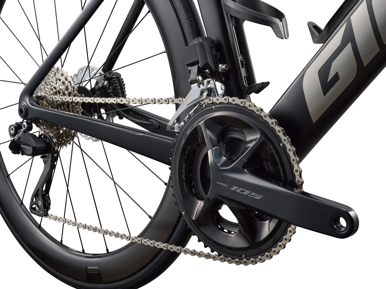 | Style | Get the most from your hard-earned pedaling power. Whether it's squeezing out more speed on solo rides or taking bragging rights in the group, the new lighter, smoother Propel Advanced makes the thrill of road speed accessible to all. Specifications:Sizes XS, S, M, M/L, L, XLColours Carbon/Stealth Chrome Frame Advanced-grade Composite, 12x142mm thru-axle, disc Fork Advanced-grade Composite, full-composite OverDrive Aero steerer, 12x100mm thru-axle, disc Handlebar Giant Contact SL Aero XS:380/360mm, S:380/360mm, M:400/370mm, M/L:400/370mm, L:420/390mm, XL:420/390mm Grips Stratus Lite 2.0 Stem Giant Contact SL Aero XS:80mm, S:90mm, M:100mm, M/L:110mm, L:110mm, XL:120mm Seatpost Giant Vector, composite, -5/+15mm offset Saddle Giant Fleet SL Shifters Shimano 105 Di2 Front Derailleur Shimano 105 Di2 Rear Derailleur Shimano 105 Di2 Brakes Shimano 105 Di2 hydraulic, Shimano RT-CL700 rotors [F]160mm, [R]140mm Brake Levers Shimano 105 Di2 hydraulic Cassette Shimano 105, 12-speed, 11x36 Chain KMC X12L-1 Crankset Shimano 105 Di2, 36/52 XS:165mm, S:165mm, M:170mm, M/L:170mm, L:172.5mm, XL:172.5mm Bottom Bracket Shimano, press fit Rims Giant SLR 2 50 Carbon Disc WheelSystem, [F]50mm, [R]50mm Hubs [F] Giant Aero Hub, CenterLock [R] Giant Aero Hub, 3-Pawl Driver, CenterLock 12mm thru-axle Spokes Sapim Tyres Giant Gavia Course 0, tubeless, 700x28c, folding Extras computer mount, water bottle cages, tubeless prepared, 32mm max tire size |