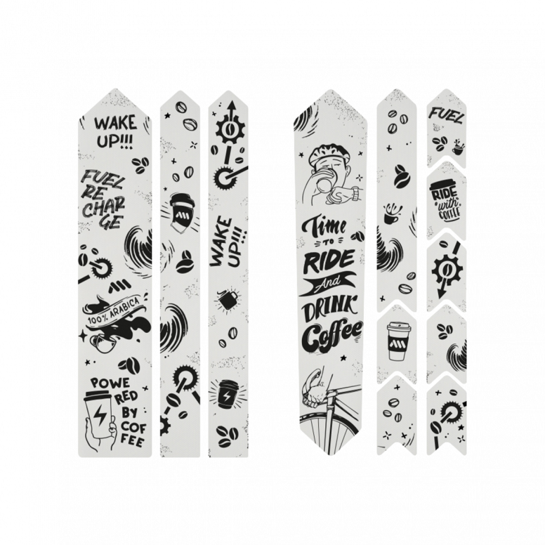 • 12 parts for a universal protection system: 1 big part for the downtube, 2 long arrows for the fork or the seat stays, 1 big part for the top tube or the seat tube, 8 arrow parts for cable rub protection and areas where tire ï¬A? ts tight with the frame.