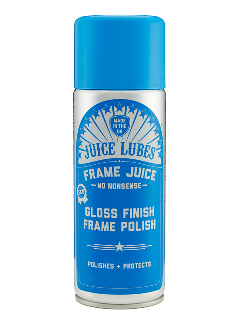 Description Frame Juice is your ticket to a box fresh bicycle after even the most miserable of mud baths. It's the final step in your bike wash and guarantees that your bike will return to the garage gleaming with no streaks and stains blotches or blemishes. Use Frame Juice as a spray-and-polish part of your bike wash or lash it on pre-ride to protect your bike with a mud-repelling force field.