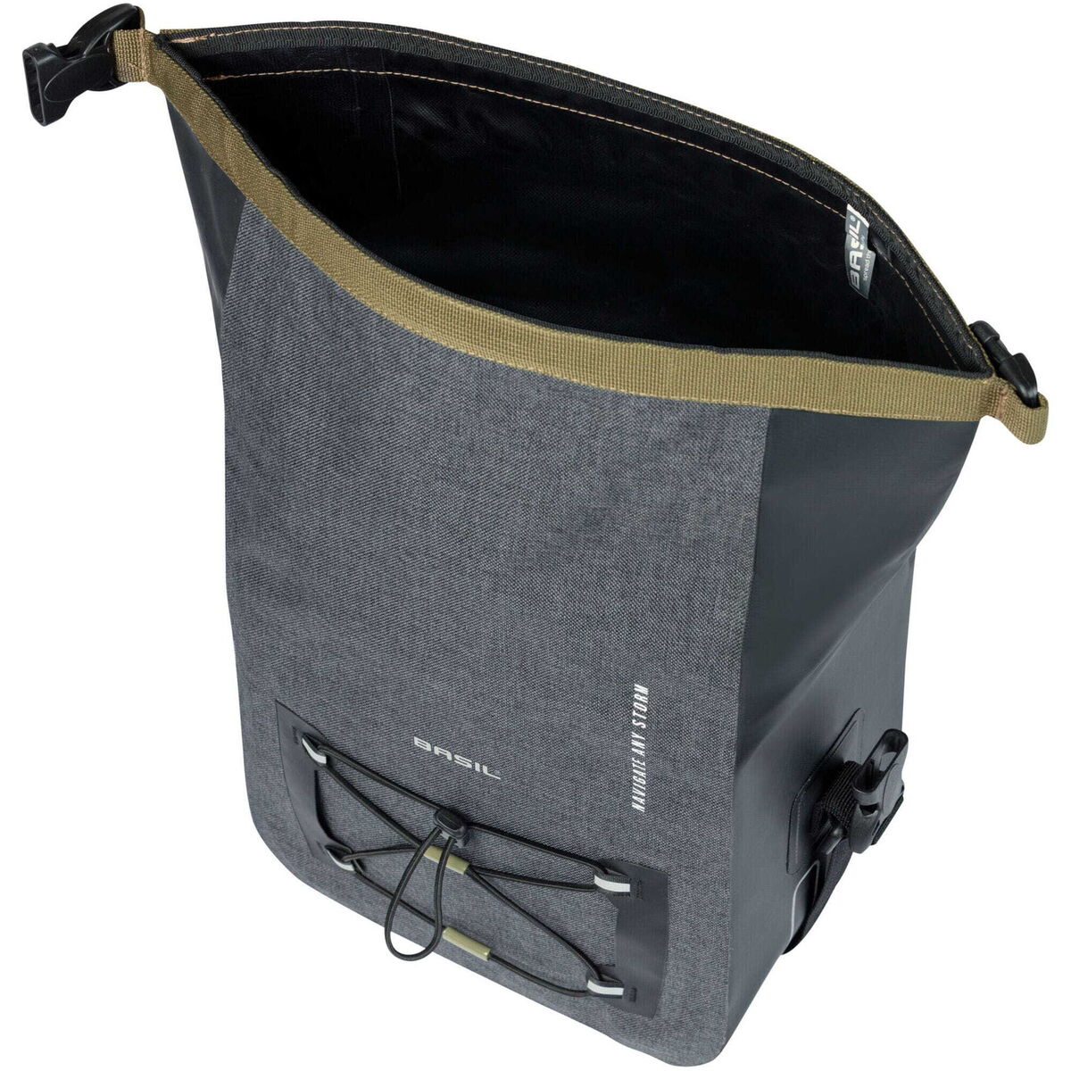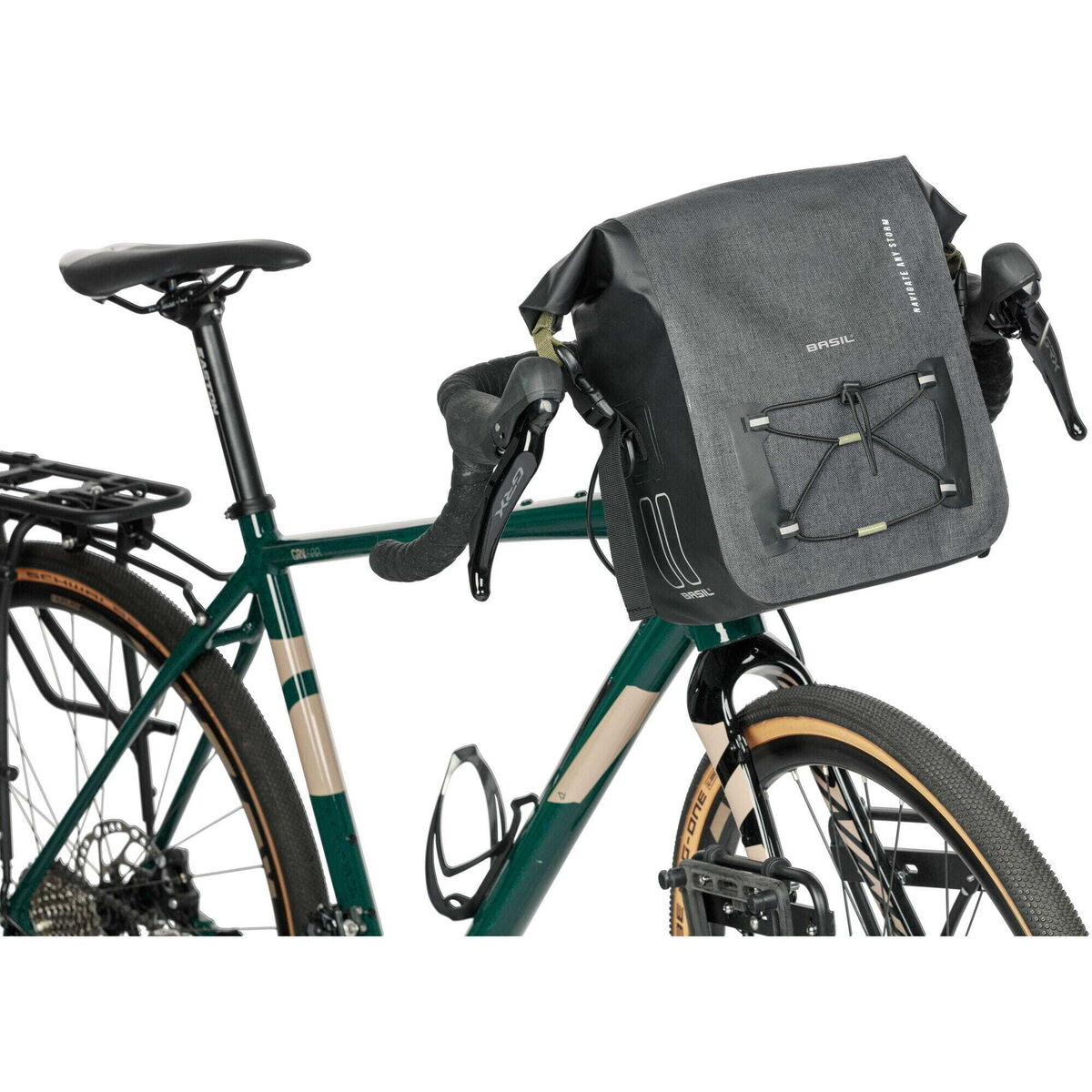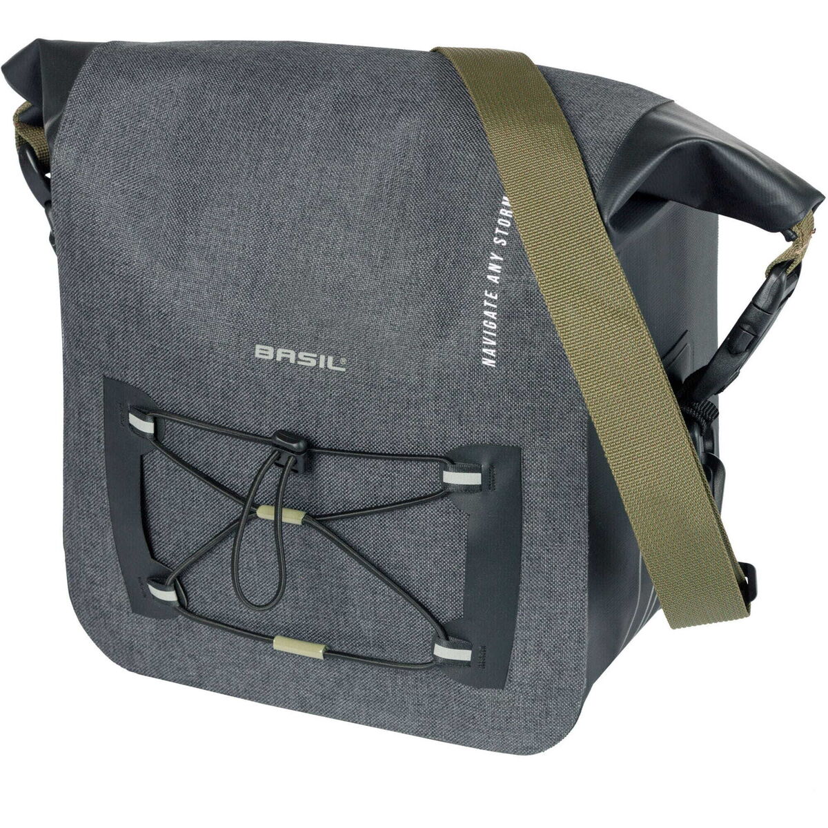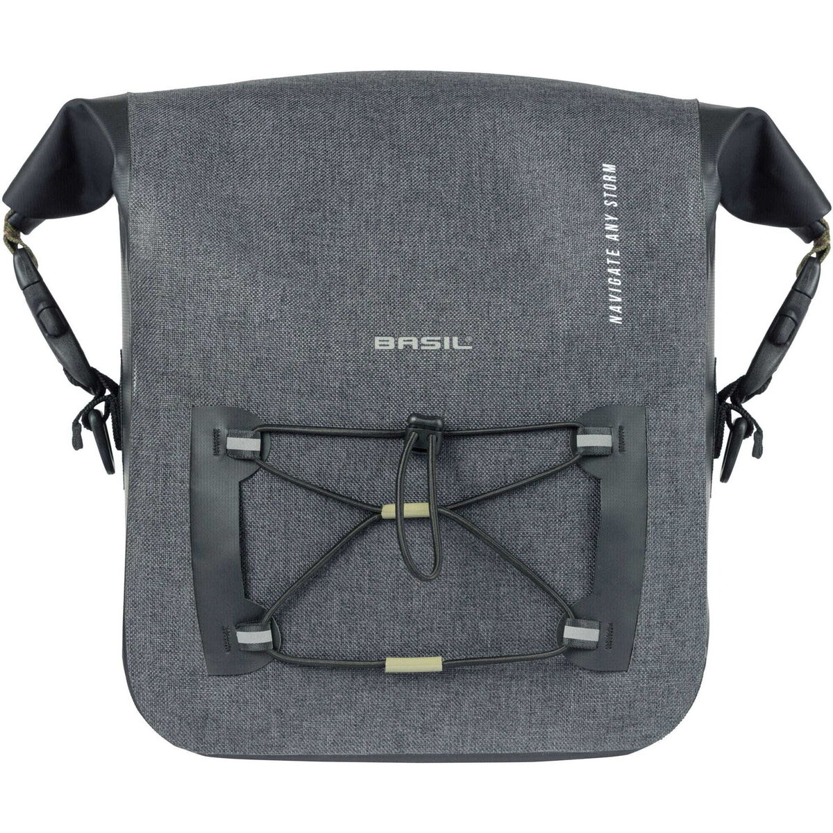 Basil Navigator Storm KF - handlebar bag - 10-11 litre - black The Basil Navigator Storm Handlebar Bag is a sporty handlebar bag for your bicycle handlebars. It is an indispensable accessory for any bike ride, from a short bike ride to a bike vacation. The bag is specially designed for carrying a smartphone or other items you may need during your trip. 100% waterproof The handlebar bag is made of waterproof polyester and tarpaulin, so it will last for years to come on your bike rides. The bag has a sporty look and fits perfectly with the other bags in the Navigator Storm collection. Everything has been thought of to ensure your belongings are carried as practically as possible. For example, an adjustable elastic cord, zipper, and mesh pocket are on the inside of the bag, and the handlebar bag can be easily closed with the roll-top closure. You'll never lose your keys again, thanks to the snap-hook. Out for a ride in the dark? No problem! The reflective Basil logos on 3 sides make you better visible. The removable shoulder strap turns this bag into a shoulder bag in no time. Simply attach the handlebar bag to your handlebar using the pre-installed KF adapter plate (KF system not included). This innovative system allows you to click your bag off and onto your handlebar in 1 second; of course also suitable for e-bikes. Features: - Waterproof (IPX3)