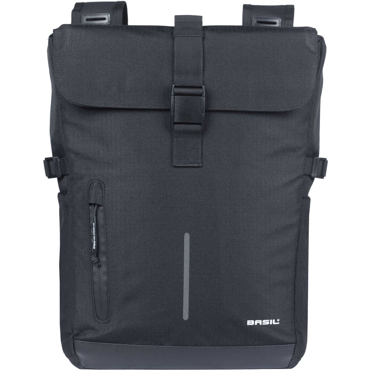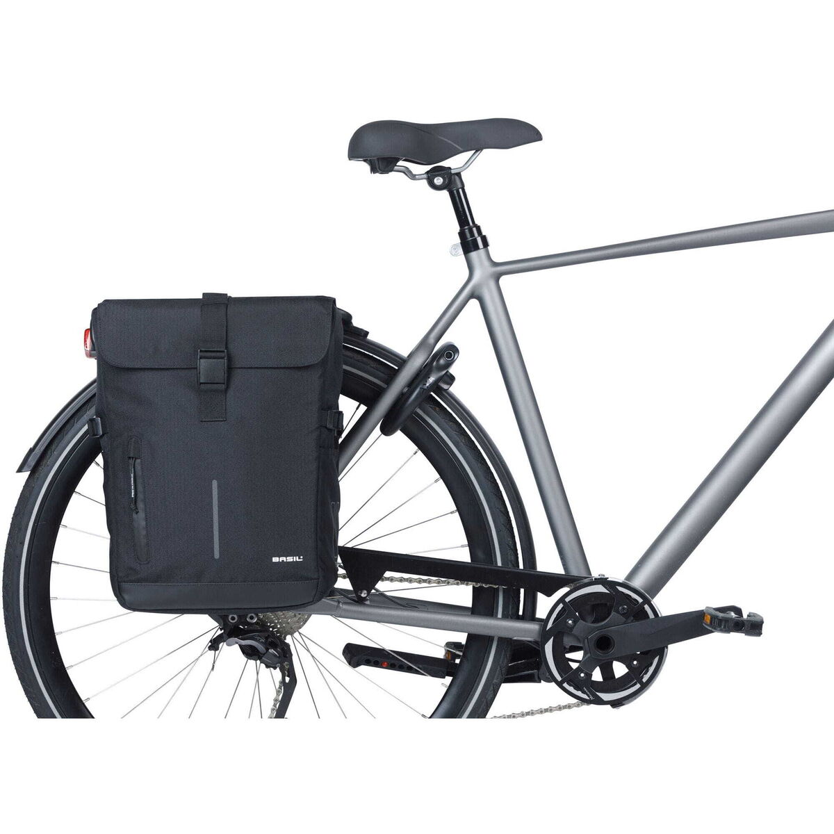 The pannier bag is available in black. The reflective details ensure that you are highly visible at dusk and dark. Moreover, the Basil Move pannier is made of water-repellent recycled polyester and equipped with a rain cover to keep your belongings dry during unexpected showers.