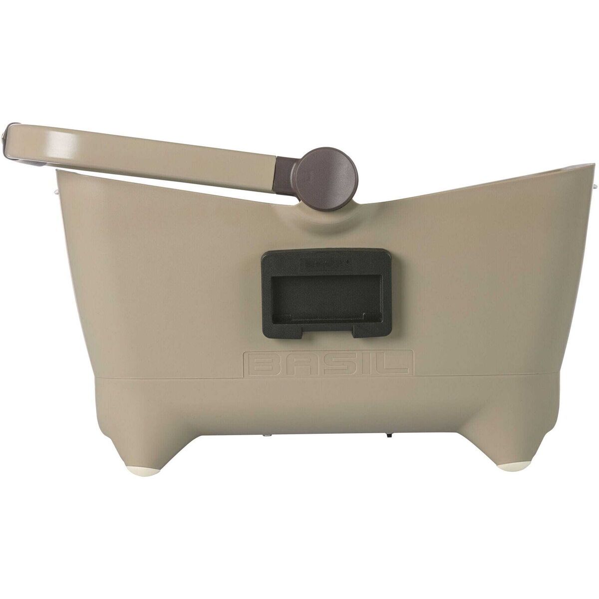 Basil Buddy KF - dog bicycle basket - front - biscotti brown Do you want to take your dog on the road in a stylish and safe manner? Then the Buddy dog bike basket is your best choice. Put your dog in the front of your bike and enjoy a nice bike ride together. The clever design of durable plastic guarantees ease of use, safety, and comfort. Your dog will not be short of anything. The basket has a cushion to lie on and even a strap for additional safety. The basket can be attached to the Basil handlebar holder. You can easily click this basket on - and off! Of course, this is included in the delivery. The unique design with handle ensures its multi-purpose functions while it can take a beating. You can take your dog with you wherever you go - without worries. Do you want extra safety for your four-legged friend? Or is your dog not always able to sit still? Then you can enhance this basket with the Basil Buddy Space Frame: a metal frame that you can click on to ensure your dog stays in the basket. Want to mount onto a MIK interface? For this SKU you will require the MIK product mounting adaptor plate 2.0 (product code BAS70173)