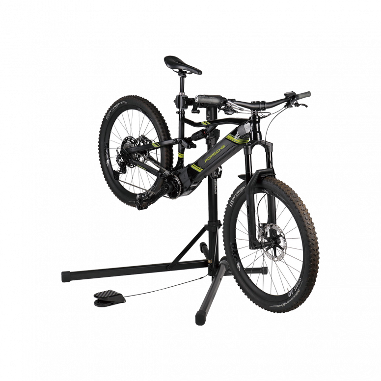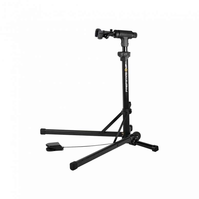 The PrepStand® eUP Pro is the first lift assisted foldable workstand â€" ideal for working on e-Bikes and other heavyweight bikes. Additional Reinforced Support Unit adds stability while a bike is mounted. The foot pedal operated, built-in pressurized cartridge provides an additional 17kg (37lb) of lifting power making easy work of raising and lowering most bikes weighing up to 35kg (77lb). A 360º rotatable clamp head with non-marring jaws quickly and securely holds your bike stable for repairs, cleaning and general maintenance. Quick release legs conveniently fold to a compact size for travel and storage.