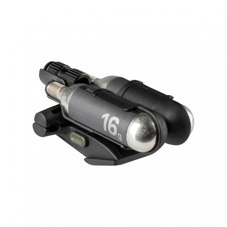 Ultra compact CO2 inflation kit featuring a Nano AirBooster CO2 inflator and two 16g CO2 cartridges. Mounts to saddle rail with included Duo Fixer which provides dual use with Topeak Duo Fixer system accessories.