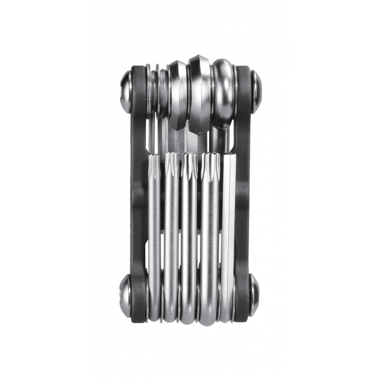 | Description | One piece, lightweight and compact folding tool. 10 pro quality hardened steel tools fold into an extruded aluminium body ideal for any cyclist. Includes: