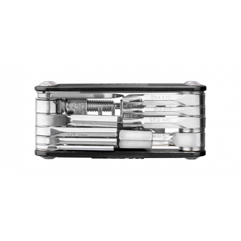 20 function pro-quality, precision mini tool with sleek forged alloy body. Integrated easy-to-use chain tool combined with a unique power link tool which folds away for a streamlined profile. Perfect for long road rides or endurance mountain biking. Includes a neoprene bag for protection.Â