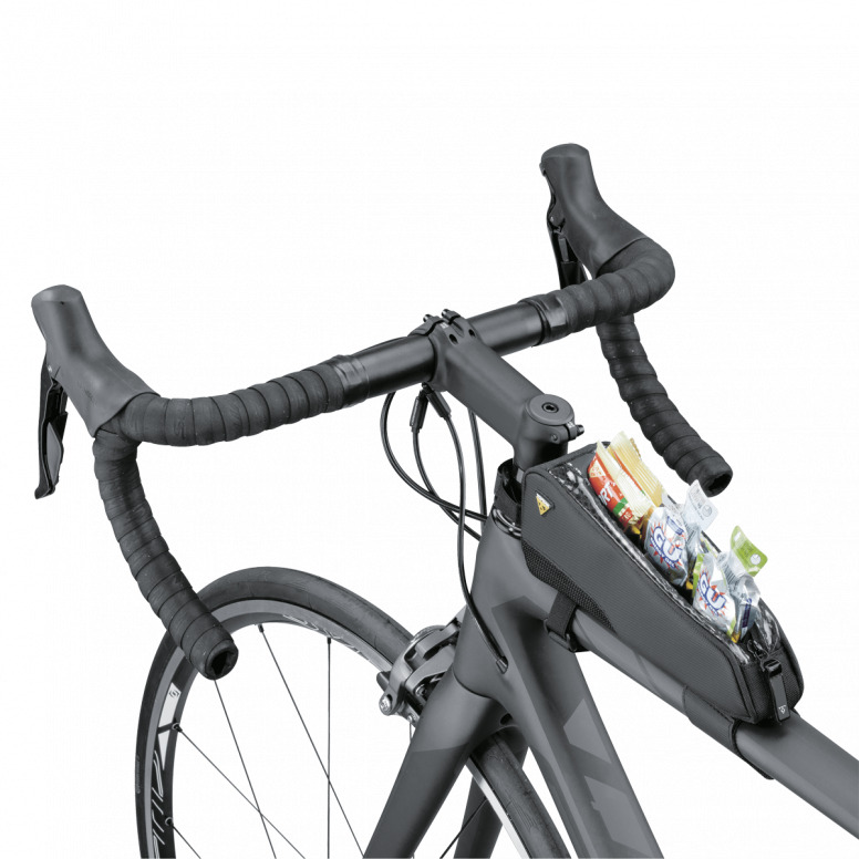 Stylish slim top tube mounted bag giving cyclists quick and easy access to energy bars, smartphone, wallet, tools or any small essential gear they need close at hand.