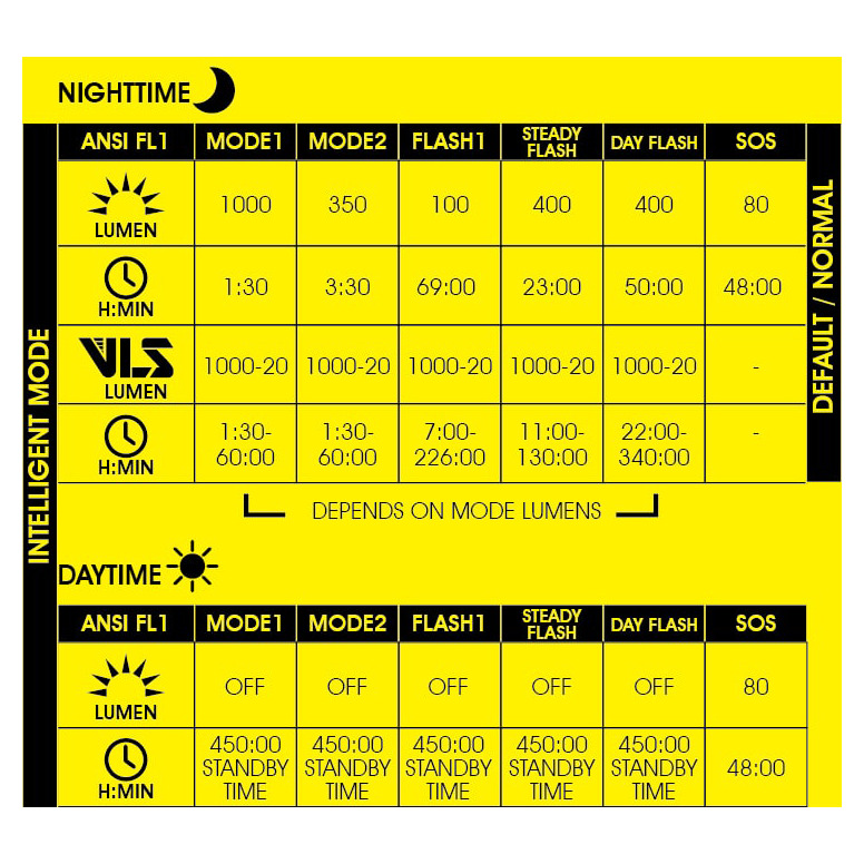 • 6 modes: MODE 1 / MODE 2 / FLASH 1 / FLASH 2 / DAY FLASH / SOS