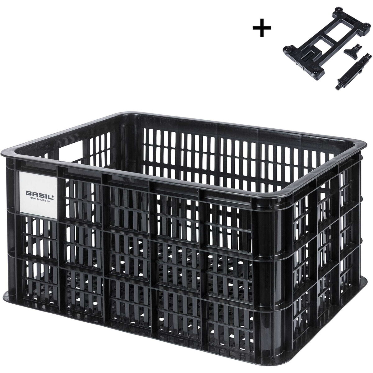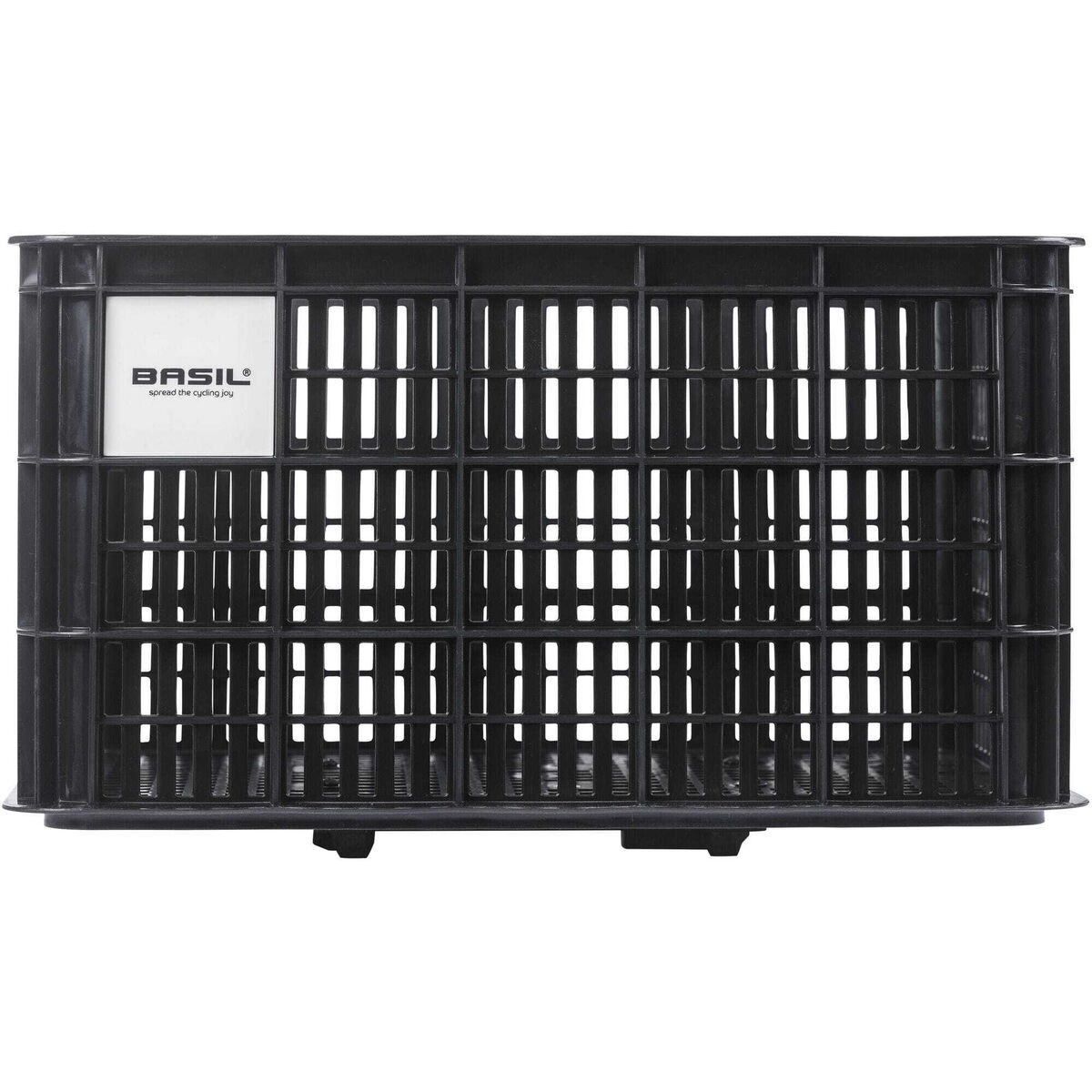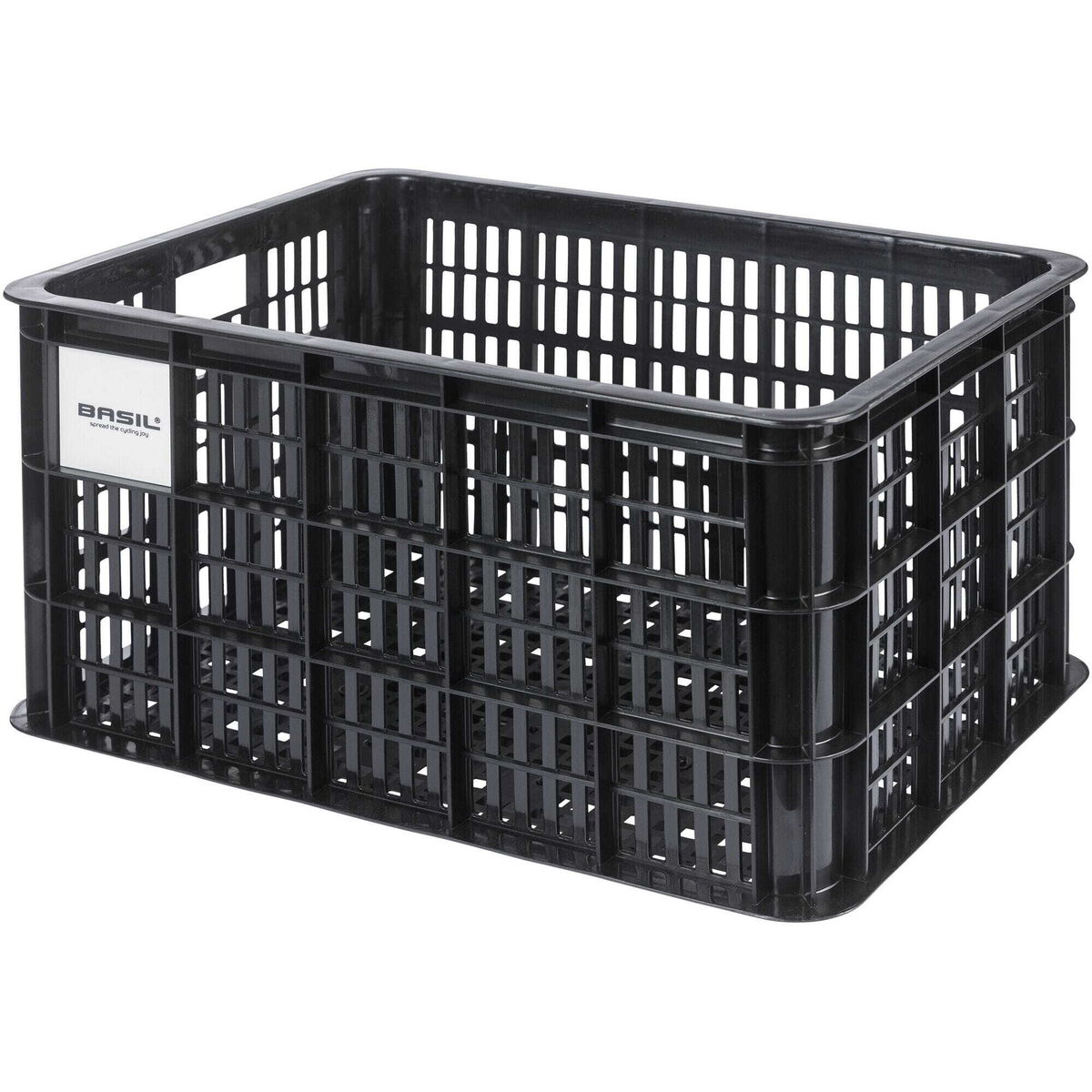 The Basil bicycle size L crate is a black bicycle crate for women's or men's bicycles. The crate is made of sustainable material, has a capacity of 40 litres, and is suitable for the MIK system.