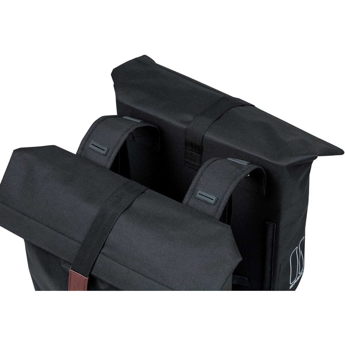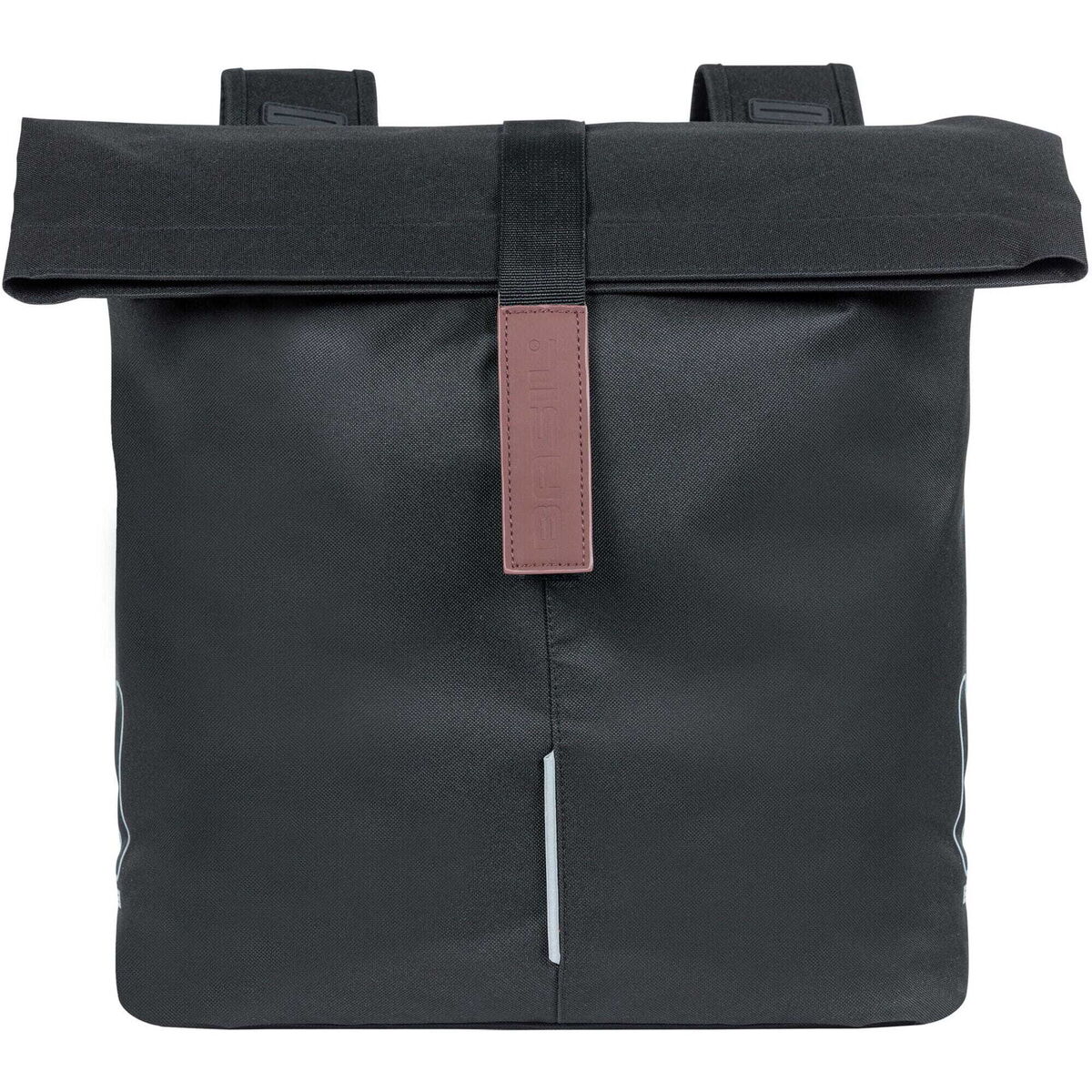 Basil City - double bicycle bag - 28-32 liter - black The Basil City double pannier fits the tempo of the city: work, friends, going out, to the market or shopping. The bike bag is compact, not too big but still spacious enough with a capacity of 28 liters. If you need a little more room, then increase your capacity to 32 liters. The folding clasp with Velcro can be adjusted in height. The folding clasp also prevents rain.