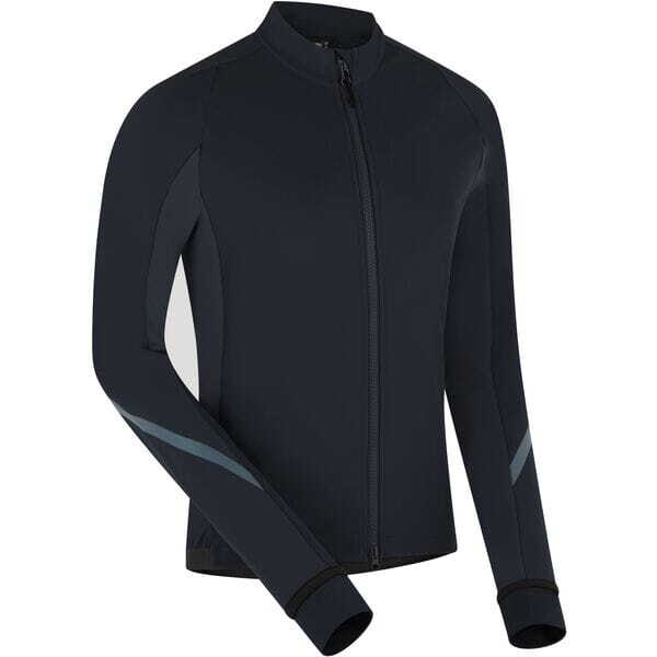 Thermal road cycling jacket with a DWR coating to repel spray and showers. Stretch body fit for athletic performance, features a drop tail and three rear pockets